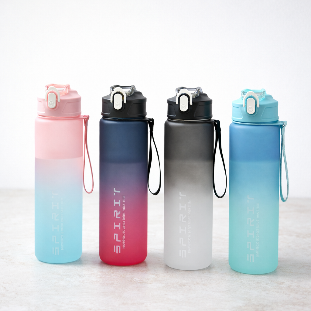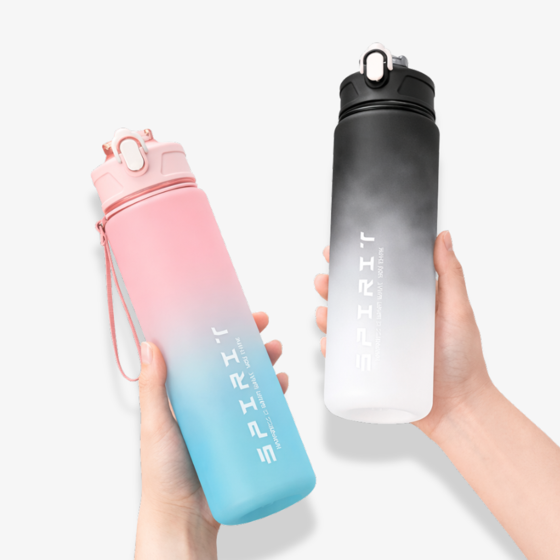 Flaskan är tillverkad i tålig och BPA-fri Tritan-plast, med en smart flip-top och säker låsfunktion som förhindrar läckage. Den kommer även med ett bekvämt handledsband som gör den smidig att bära med sig – perfekt till gymmet, kontoret, skolan eller i väskan när du är på språng.